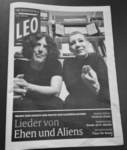 »Gute-Laune-Musik, die auch ohne Heile-Welt-Lieder auskommt! Das scheint das Erfolgsgeheimnis von Shakti und Mathias […] zu sein. Die Botschaft ihrer oft humorvollen Lieder ist authentisch, so wie das Leben selbst. […] Im Interview auf Seite 3 erfahren sie noch mehr Persönliches über dieses außergewöhnliche Singer-Songwriter-Duo. […] Sie haben seit Kurzem eine eigene Plattenfirma und managen sich selbst. […] Und das Singer-Songwriter-Paar aus Kaiserslautern kommt mit seinen Liedern, die mal frech gegen den Strich bürsten, mal warmherzig bezaubern, bei einem wachsenden Publikum weit über die Grenzen der Pfalz gut an. Gerade haben sie die CD ›Komisch‹ mit ›Popularmusik vom Allerfeinsten‹, im vergangenen Jahr ›Lieder zum täglichen Gebrauch‹ produziert. Von Leben, Liebe, Konzerten und Shaktis Kunst erzählen sie im LEO-Interview.«